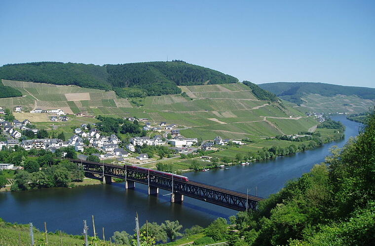 Auf 786 Metern fährt die Moselweinbahn auf diesem Hangviadukt, das sich in die Moselhänge schmiegt und fast mit ihnen zu verschmelzen scheint. Wenn du aus dem Fenster schaust, erblickst du die Steilhänge, die zur Mosel hin abfallen, bewachsen mit Weinreben in denen hier und da ein Weinbergshäuschen zu sehen ist.