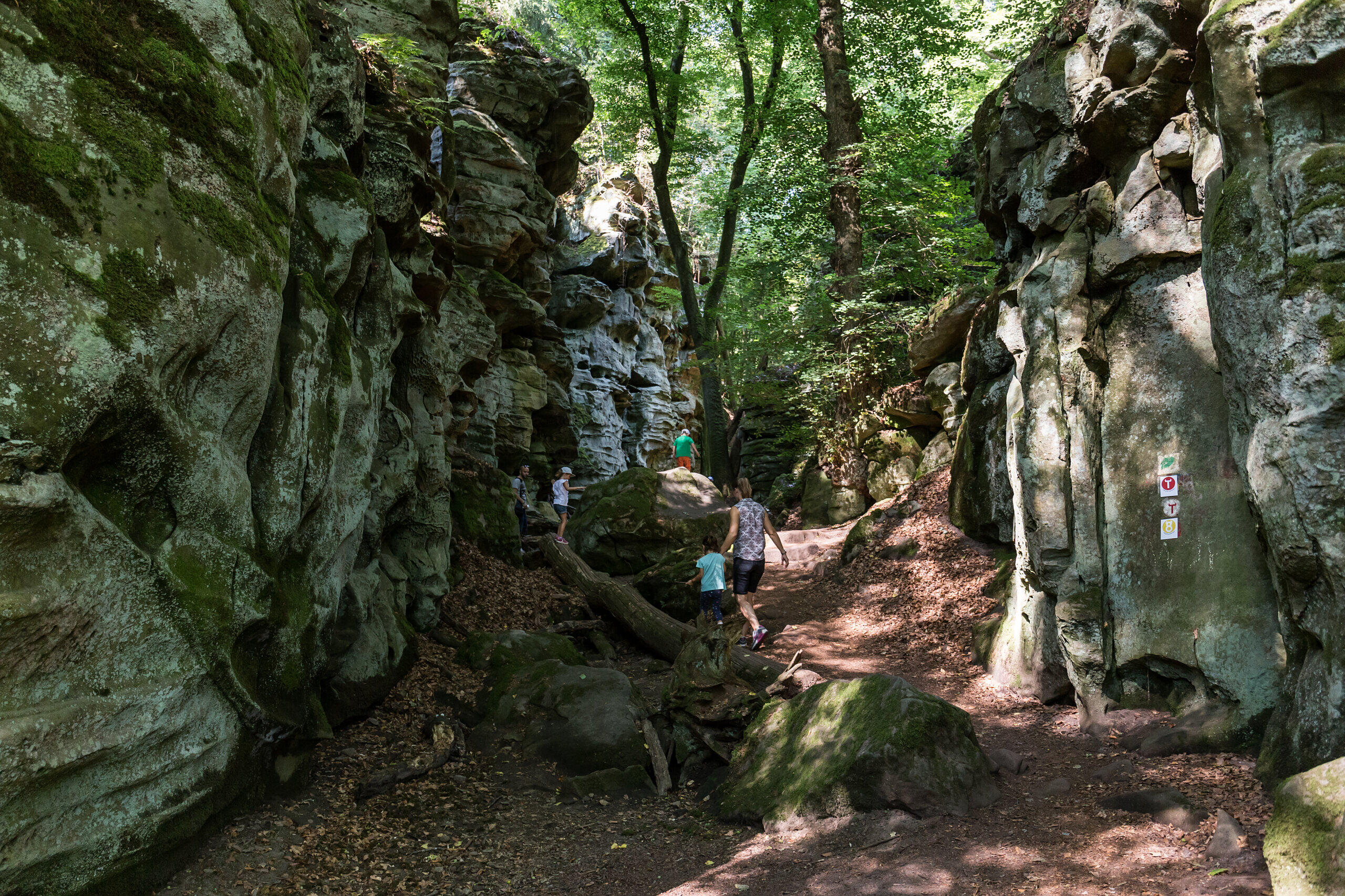 Der Teufel selbst schien seine Krallen in die Erde geschlagen zu haben, um die tiefen Spalten und hohen Felswände zu erschaffen. Den Eindruck könnte man bei einer Wanderung durch die Teufelsschlucht im Felsenland Südeifel gewinnen. Fest steht, dass die Schlucht ein Produkt der letzten Eiszeit ist. Vor etwa 12.000 Jahren gab es in der Südeifel einen starken Wechsel zwischen Frost- und Tauperioden. Diese Temperaturwechsel ließen gewaltige Felsen am Rand der Hochfläche Ferschweiler Plateau abbrechen. Ein riesiger Sandsteinblock brach damals aus der Plateauwand heraus und hinterließ eine 28 Meter tiefe Felsspalte: die Teufelsschlucht. Heute bietet uns diese zerklüftete und raue Landschaft ein einzigartiges Wandererlebnis, das sich das ganze Jahr über lohnt.  5 Wanderrouten in der Teufelsschlucht: Für Anfänger und Profis Zwischen Ernzen und Irrel liegt die Teufelsschlucht inmitten des Naturparks Südeifel. Vom Wanderparkplatz in Ernzen aus kann es losgehen. Zunächst führt der Weg durch sanften Mischwald, das Gelände ist gemäßigt und hat kaum Steigungen.  Ein kurzer Spaziergang führt dich zum Naturparkzentrum Teufelsschlucht. Hier kannst du bei der Tourist-Information oder im Naturparkmuseum viel Wissenswertes über die Entstehung und die Geschichte des Felsenlandes bekommen. Auch kannst du dich im Naturparkbistro stärken, bevor die Wanderung beginnt. Der Naturparkshop bietet seinen Besucher*innen Bücher und Wanderkarten sowie Souvenirs und Mitbringsel an. Wenn du kein*e geübter Wanderer*in bist, brauchst du dich nicht zu sorgen. Die Teufelsschlucht klingt zwar herausfordernd. Aber es gibt für jede Kondition eine geeignete Route, auch für Familien mit Kindern. Und jede davon führt dich durch eine fantastische Landschaft.  Der kleine Rundweg Der kleine Rundweg beginnt und endet am Naturparkzentrum Teufelsschlucht. Um nicht auf falschen Pfaden unterwegs zu sein, orientierst du dich an der Markierung mit dem weißen Teufels-T auf einem roten Hintergrund. Der Eingang in die Teufelsschlucht fühlt sich an, wie der Abstieg in eine andere geheimnisvolle Welt. Stufen aus Steinen führen hinab in Schlucht. Hier und da musst du den Kopf einziehen und dich zwischen Felsen hindurch wagen. Dort, wo heute Ausflügler unterwegs sind, war vor Urzeiten ein Meeresboden. Versteinerte Fossilien sind an den Felswänden hier und da noch zu sehen. Zum Teil ragen bis zu 30 Meter hohe Felswände vor dir auf. Vom Ferschweiler Plateau hast du einen tollen Blick über die bewaldete Landschaft. Tipp: Mit der kostenlosen Lauschtour-App auf dem Handy kannst du die Audiotour Teufelsschlucht anhören. Länge: 1,6 Kilometer Schwierigkeitsgrad: mittel Für wen geeignet: Familien mit Kindern, ohne Kinderwägen; Wanderbeginner*innen Wie erkenne ich den Rundweg: weißes Teufels-T auf rotem Hintergrund Der große Rundweg Auch der große Rundweg durch die Teufelsschlucht hat seinen Start- und Endpunkt beim Naturparkzentrum. Diese Wanderroute ist für Familien mit Kindern geeignet. Allerdings dauert sie etwas länger. Genügend Zeit, um auf schmalen Pfaden durch die felsige Landschaft zu wandern, solltest du für diese Tour einplanen. Der große Rundweg verlängert den kleinen Rundweg um eine Schleife, die durch weitere fantastische Felsformationen einschließlich der historischen Mühlsteinbrüche an der östlichen Kante des Ferschweiler Plateaus verläuft. Länge: 3,5 Kilometer Schwierigkeitsgrad: mittel Für wen geeignet: Familien mit Kindern, ohne Kinderwägen; Wanderbeginner*innen und -Geübte Wie erkenne ich den Rundweg: Das Teufels-T ist rot und befindet sich auf einem weißen Hintergrund. Die Teuflische Acht Schon etwas anspruchsvoller ist der Rundweg die "Teuflische Acht", der ebenfalls am Naturparkzentrum beginnt und endet. Der Name Teuflische Acht kommt von der Form der Route, die dieser Wanderweg auf der Karte zeigt. Der erste Teil verläuft durch die faszinierende Felsenwelt der Teufelsschlucht. Auf deinem Weg ins Tal kommst du den Irreler Wasserfällen immer näher. Dabei handelt es sich um Stromschnellen des Flusses Prüm, die am Boden der Schlucht ihren Weg nimmt. Leider ist der Zugang für Besucher*innen zu den Irreler Wasserfällen aktuell gesperrt, da durch das Jahrhunderthochwasser diesen Sommer auch die vergleichsweise kleine Prüm zu einem reißenden Fluss wurde. Das Flussbett und die umliegenden Felswände sind dadurch unterspült worden. Die Besucherbrücke über die Irreler Wasserfälle wurde mitgerissen und zerstört. Bis alles wiederhergestellt ist, können die Irreler Wasserfälle leider nicht besucht werden. Dafür führt die Strecke der Teuflischen Acht dann weiter hoch zum Rand des Ferschweiler Plateaus. Entschädigt wirst du dann durch abenteuerliche Felspanoramen, an denen du entlangwanderst. Zuletzt gelangst du zu den alten Mühlsteinbrüchen, an denen heute noch kreisrunde Spuren der Steinhauer-Meißel zu sehen sind. Von hier geht es vorbei am VIA-Punkt wieder auf das Hochplateau und zurück zum Naturparkzentrum. Länge: 6 Kilometer Schwierigkeitsgrad: mittel Für wen geeignet: Familien mit Kindern, ohne Kinderwägen; Wanderbeginner und -Geübte Wie erkenne ich den Rundweg: Eine weiße Acht mit teuflischen Hörnern auf einem gelben Kreis Wanderweg Nr. 54 Dieser Wanderweg führt nicht ausschließlich durch die Teufelsschlucht. Auch das Dorf Ernzen liegt auf der Route. Startpunkt ist das Besucherzentrum, von wo der Weg oberhalb der Teufelsschlucht bis ins Tal der Prüm und des Hälbachs führt. Dann wieder hinauf auf die Hochfläche. Insgesamt überbrückst du einen Höhenunterschied von 170 Metern. Nach dem Aufstieg auf das Plateau folgt eine Strecke auf weitgehend ebenen Wegen durch den Wald und über Felder und durch das Dorf Ernzen. Länge: 8,1 Kilometer Schwierigkeitsgrad: mittel Für wen geeignet: Wandergeübte Wie erkenne ich den Rundweg: rote Zahl auf weißem Grund  Felsenweg 6 Zu Deutschlands schönsten Wanderwegen gehört der Felsenweg 6. Diese Route ist ein Eifel-