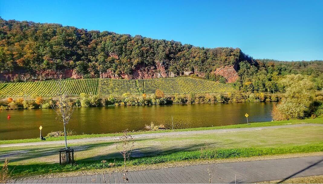 Die Mosel bietet dir zu jeder Jahreszeit einen herrlichen Ausblick. Und gerade jetzt im Herbst hat sie sich in die schönsten Farben gekleidet. Du hast einen tollen Blick auf die westliche Moselseite, wo sich die roten Felswände mit Weinbergen und Stadtpanorama abwechseln.