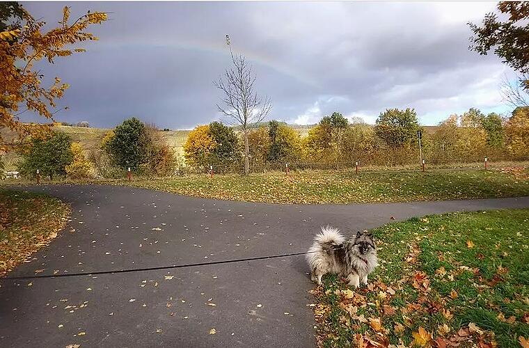 An der Zufahrt zu Korlingen, bevor es wieder den Berg hinab zum Dorf geht, sind auf beiden Seiten der Straße Parkgelegenheiten. Viele Jogger, Spaziergänger und eben auch Hunde sind dort Sommer wie Herbst unterwegs.