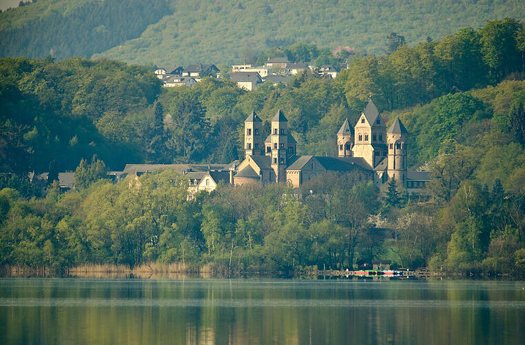 Deine Route führt dich auch an Überbleibseln der menschlichen Besiedlungsgeschichte des Laacher Sees vorbei. So befindet sich am Südufer des Sees ein mittelalterlicher Abfluss-Stollen, der einst als Hochwasserschutz für die Klosteranlage Maria Laach diente. Diese schöne mittelalterliche Abtei kannst du bei deiner Wanderung auch besuchen. Sie liegt idyllisch zwischen den Bäumen. Oder du legst am Seehotel Maria Laach eine Pause ein, bevor es auf dem Rundweg weiter zum Ausgangspunkt geht.